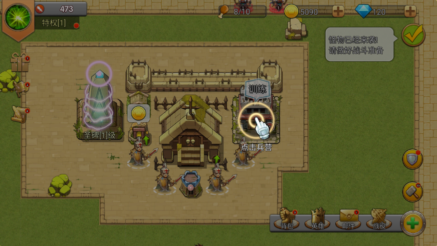 6、想要成功的阻击敌人,除了按照以上方法进行操作以外,玩家还应训练一支强大的队伍,如图所示,点击兵营,然后点击士兵即可开始训练;