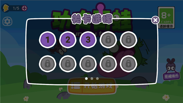 1、这一关还没有延伸舌头的玩法设定,下面是功夫蛙第三关的情况。