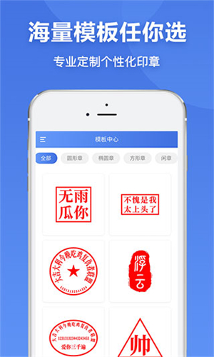 1、印章生成含各种印章模板,样式丰富多样,包括圆形印章、方形印章、椭圆印章。