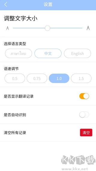 除了在首次打开应用时能够直接设置界面语言之外,在“我的”——“设置”中也能设置App界面语言,支持泰语、中文、英语三语切换,用户可根据个人习惯选择,同时支持调整应用内文字大小,以及语音语速的调节,共四种档位。