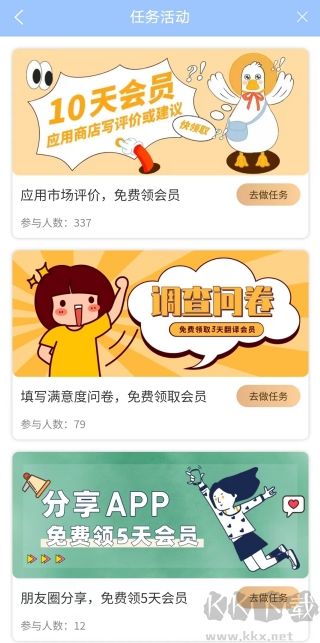 首次下载安装这款应用的用户会拥有30次的免费翻译机会,大家可以体验试用这款应用之后再斟酌这款应用适不适合您,需不需要开通付费服务,最低9.9元/元即可享受无限次泰语文本翻译,除此之外,还能够在主页下方的活动专区白嫖到3~10天的免费会员功能实用,只需要分享App或填写问卷等即可。