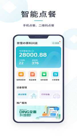 1、呈现智能点餐界面,支持手机及二维码点餐,显示奈雪の茶科兴店当日营收等数据,有多项管理功能。