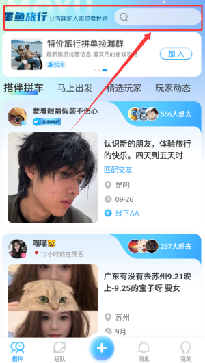 3、进入组队功能搜索意向城市,轻松创建或加入旅行团队。