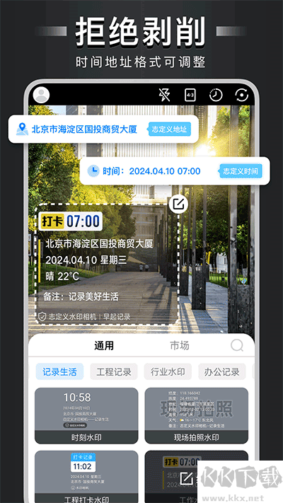 设置水印内容:在水印相机的主界面,你可以看到各种预设的水印模板。根据自己的需求,选择合适的水印模板。点击模板后,你可以编辑水印内容,如时间、地点、天气等。同时,你还可以自定义水印文字、颜色和字体,让你的水印更加个性化。