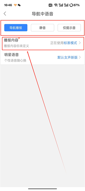 5、在最上方可切换语音提醒方式,点击【播报内容】可以设置语音提示的信息;