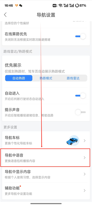 4、找到下方更多设置下的【导航中语音】即可设置导航时的路线语音提示;