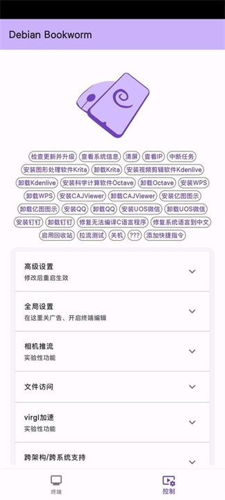可以使用容器自带的tmoe但并不保证安装了能用哦(事实上,目前容器里的VSCode、输入法都是用tmoe安装的就连系统本身也是用tmoe安装的,也可以在网上搜索ubuntu安装xxx教程”inux安装xxx教程等等本软件也提供一些基本软件安装按钮包括图形处理,视频剪辑,科学计算相关的软件稍后你就会看到