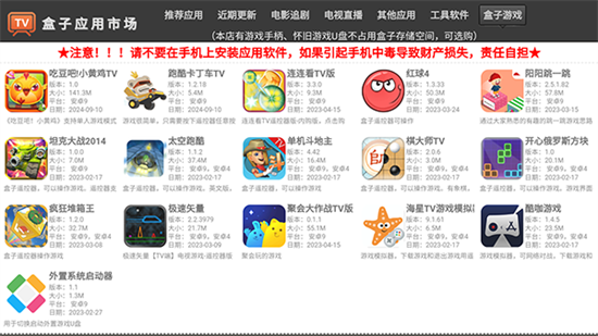 盒子应用市场是一款可以在电视端安装使用的应用商店软件。只需在电视端安装软件,即可一键安装软件中的应用程序。内置资源实时更新,过期软件及时清理,为用户提供便捷实用的下载体验。