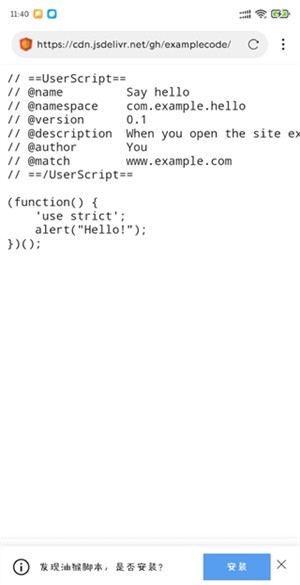 1、通过脚本的URL进行安装最直接的方式,你只需要在网梭浏览器中打开脚本的URL,浏览器检测出是油猴脚本会自动提示您安装,如下图所示。