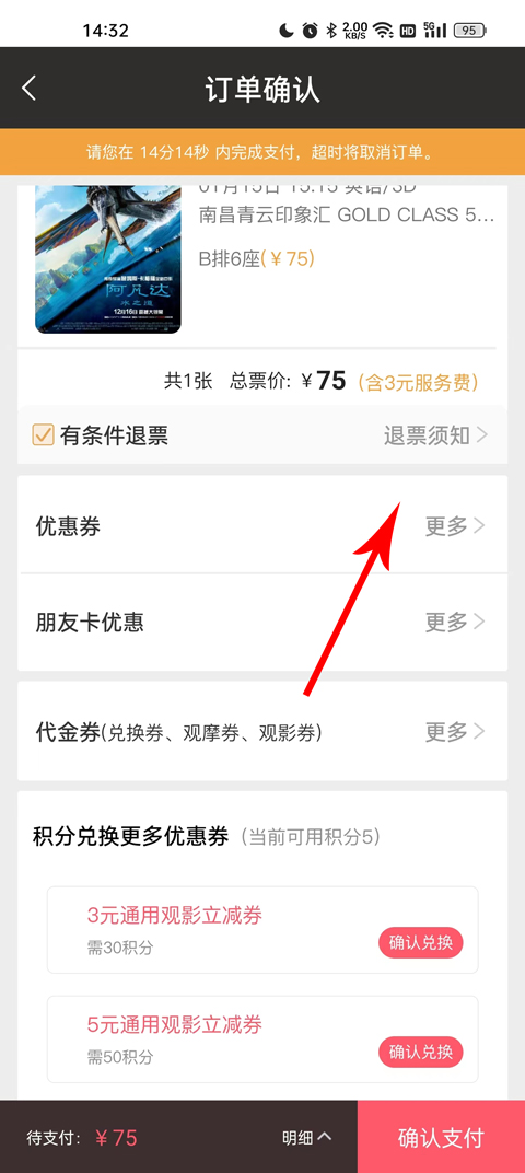 4、因为你是新注册用户,一般平台都会送优惠券,所以使用优惠券抵扣相应的金额,购票会更加便宜。