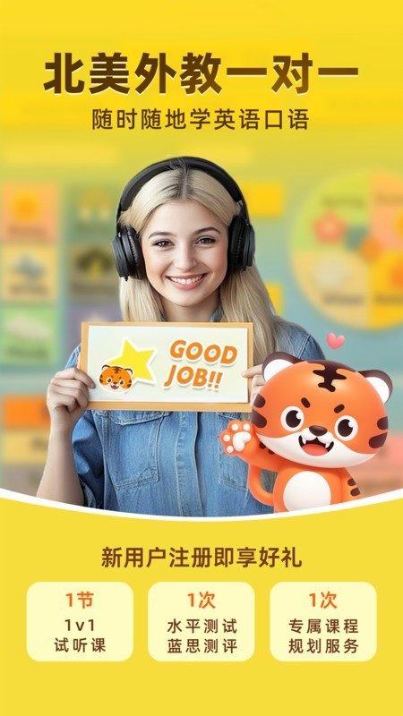 Tigerschool APP是一款专注于在线一对一口语学习的全方位平台,专为孩子和成人打造,学练测结合,全面提升学员英语能力。为广大英语学习者提供优质、个性化的英语学习体验。下载注册即可领外教精品体验课。Tigerschool借助强大的师资力量、标准的美国小学教材,打造生动有趣的课堂体验,通过北美外教1对1在线教授英语,帮助学员更有效学习和掌握英文口语。让小龄学员和成人学员在家就可以快乐、高效地提升英语水平,接触优质的国际教育!