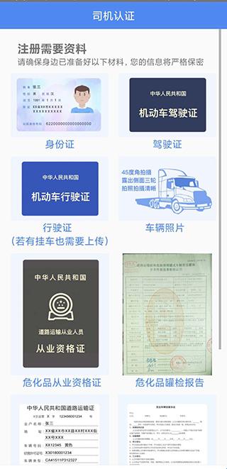 4、下一步,需要司机认证,需要准备以下材料:身份证、驾驶证、行驶证、车辆照片、危化品从业资格证、危化品罐检报告、道路运输证、车辆使用权协议。