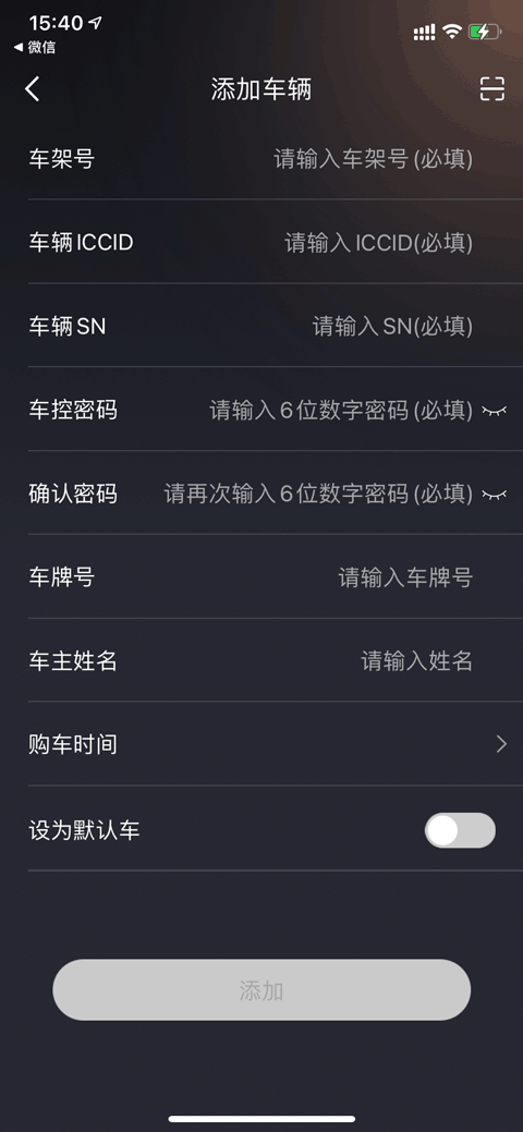 2、在添加车辆页面中输入相关信息,然后点击添加按钮就绑定车辆了。