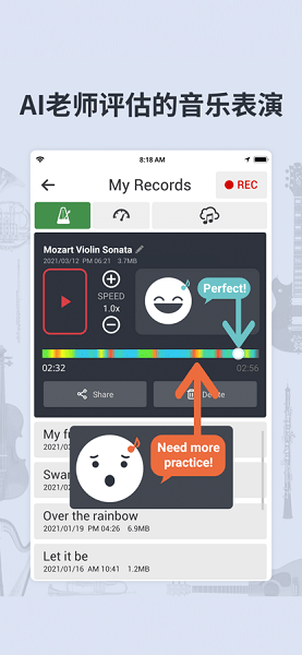 3、调音定弦识别过程快速精准。包含调音器、节拍器、视频教学三大功能模块给你。