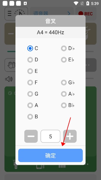 2、箭头往左表示音低了,箭头往右表示音高了,箭头在正中间变成绿色音就准了。