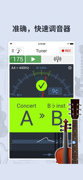 2、吉他、尤克里里等乐器的快速、准确调音、自动调音也可手动调音,自动纠正啦。