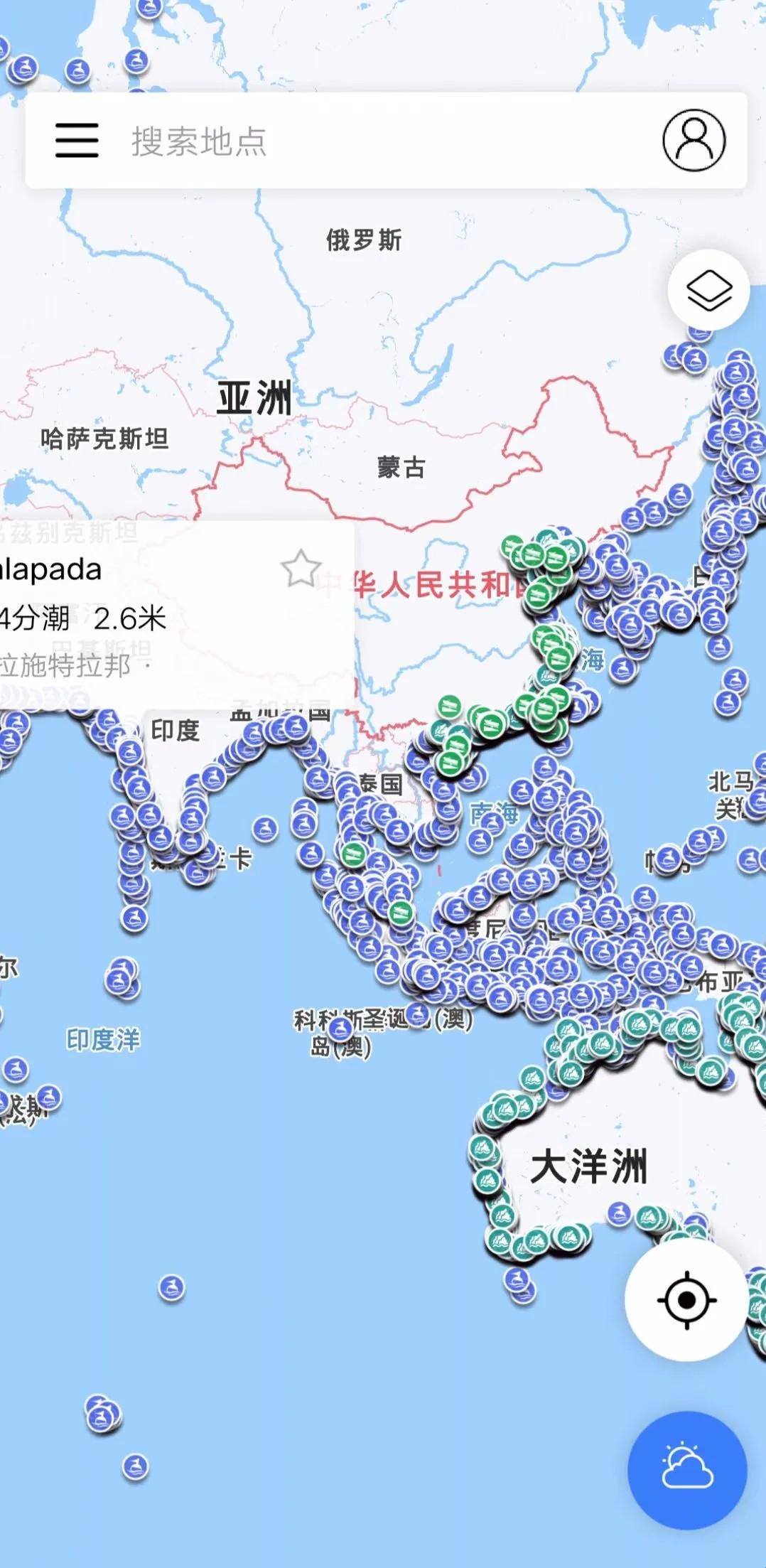 1、主界面可以放大、缩小查看全球站点的天气状况、潮汐、温度、风向等信息。点击任意站点即可查看该站点的天气与潮汐信息。