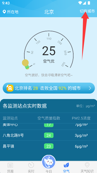 3、若想关心远方朋友的呼吸,点右上角就能瞬间切换城市,满足你“环游全国”视察空气的宏伟愿望。