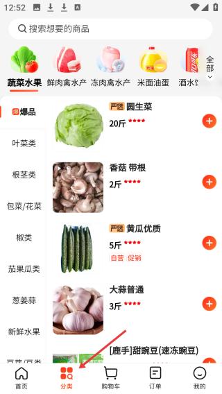 2、点击分类蔬菜水果分类界面,上方是搜索与全部分类,下方按蔬菜类别陈列商品,部分标注严选、促销,方便选购。