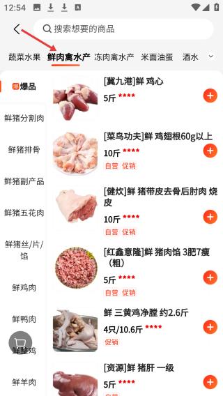 3、点击分类里面鲜肉禽水产分类页,上方有分类导航,下方呈现多种肉类商品,多有自营、促销标识,凸显商品特色。