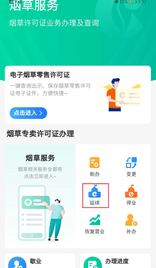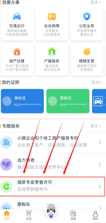 1、打开APP,点击首页“专题服务”的“烟草专卖零售许可”进入。