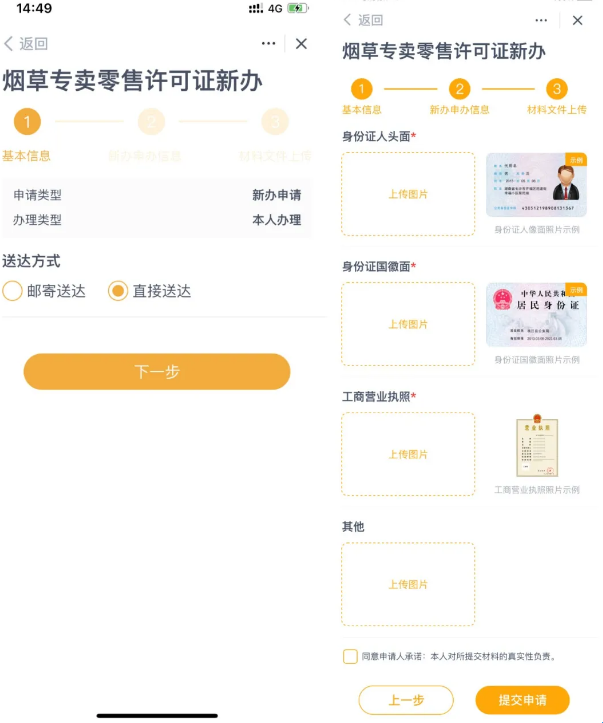 3、根据申请提示输入相关信息,并在上传所需要身份证正面和反面以及营业执照,(注意:拍照上传的图片必须清晰全面,不能只拍一部分),上传完所需图片后点击下方“提交申请”即可完成相关事项的申请事项。
