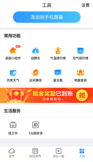 4、开始一刻页面,有短视频可以供用户观看娱乐。工具页面,可以将天气小组件添加到手机屏幕,还有台风路径和地震查询等常用功能,更有生活服务在等你来体验。