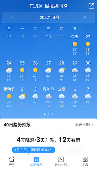 3、在40日天气页面,可以查看未来40日的天气预报,还会自动统计升降温天数和下雨天数,让你一目了然。
