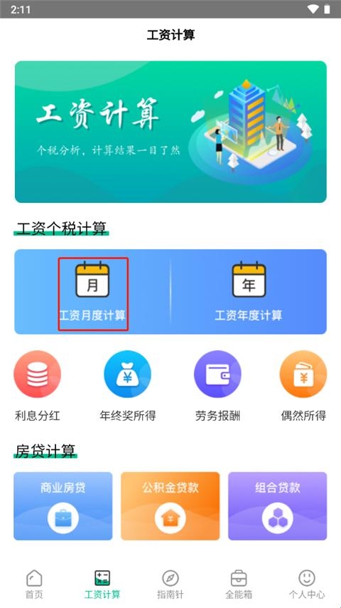 1、进入软件,在工资计算栏中,为用户提供了月度/年度工资计算、利息分红、年终奖所得、劳务报酬、偶然所得等等计算,我们点击工资月度计算;