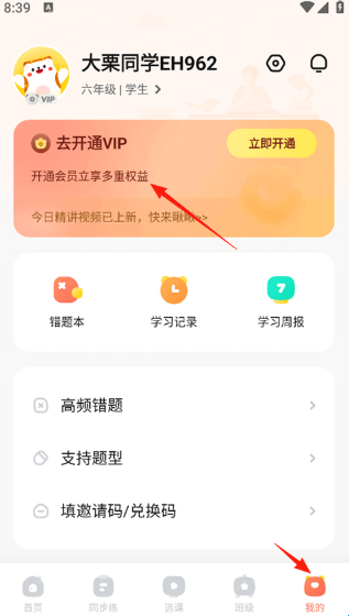 1、打开作业帮口算APP,点击我的-VIP功能。