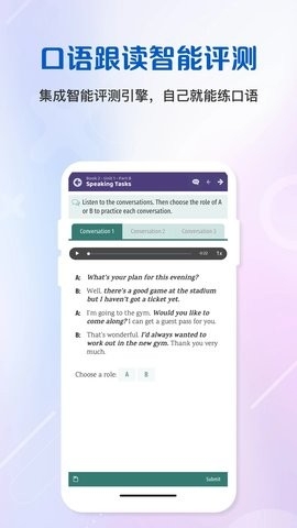 2、内置英语跟读自动评分引擎,实现口语跟读自主训练。