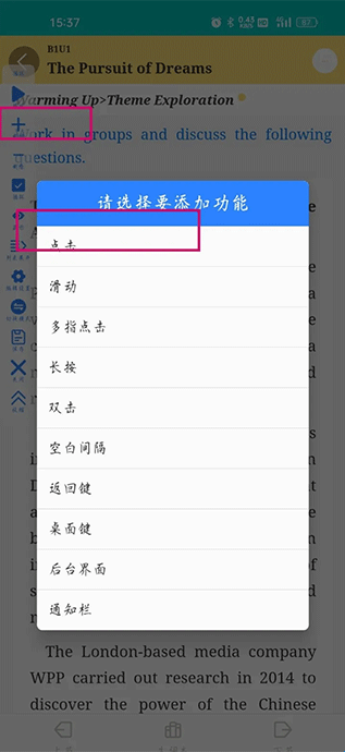3、打开连点器进入welearn要刷书本的第一单元的第一节,然后新增加点击。