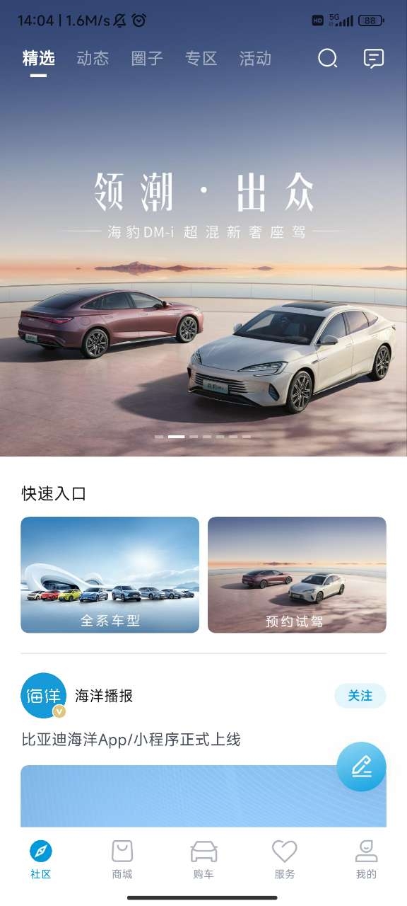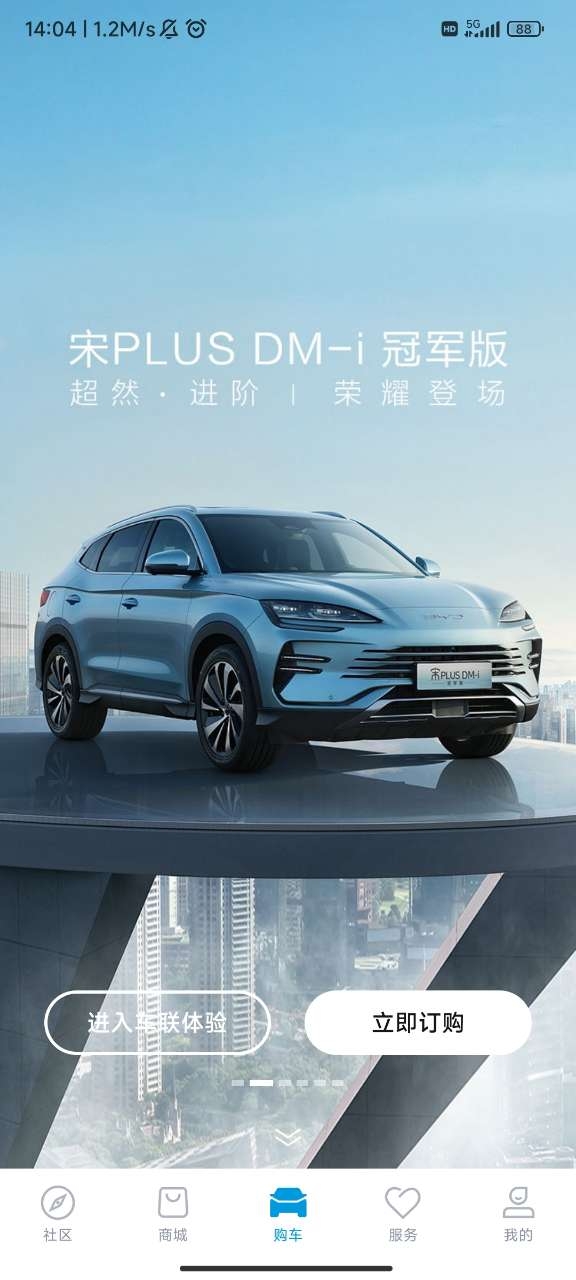 1、下载后进来就能看到最新界面,还有主菜单有五个版块,分别是社区、商城、购车、服务和个人中心。