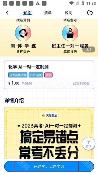 1、进入软件后选中已经购买的测评学科,点击底部【已购买,点击学习】