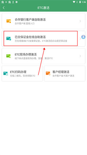 2、有五种激活方法,分别是“合作银行客户端自助激活”、“已交保证金在线自助激活”、“ETC现场办理激活”、“ETC扫码办理”和“客户经理激活”,推荐选择“已交保证金在线自助激活”,因为其他激活方式都可以让银行工作人员帮你操作。