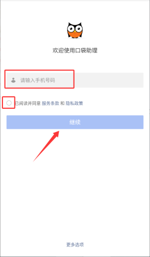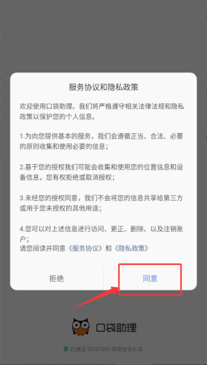 1、启动口袋助理应用,在协议页面点击“同意”授权条款。