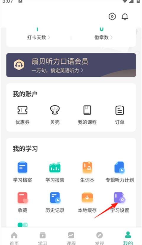 2、再点击屏幕右侧的“学习设置”。
