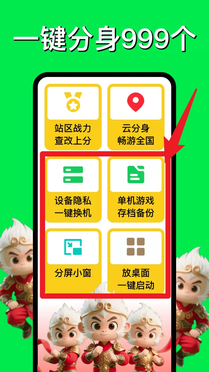 1. 在首页点击「一键分身999个」图标,即可进入功能页,自由创建多个分身应用,还能为单机游戏保存进度。