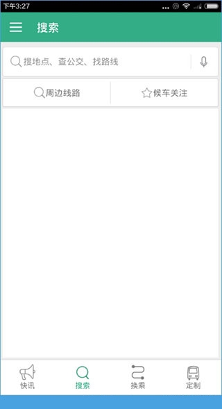 2、进入搜索页面,用户可以搜索你想查询的公交,并支持了解周边的线路和候车关注哟。