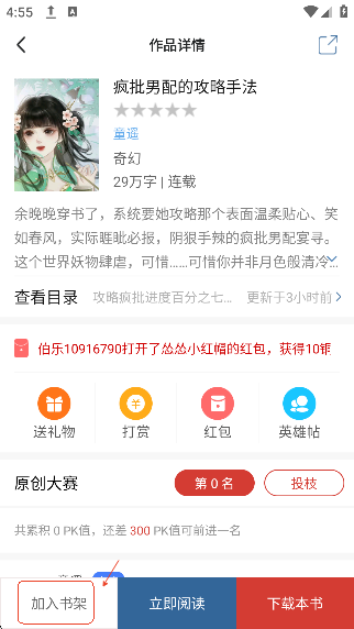 然后用户直接点击作品,再点击“加入书架”将喜欢的书籍加入书架,方便下次查看