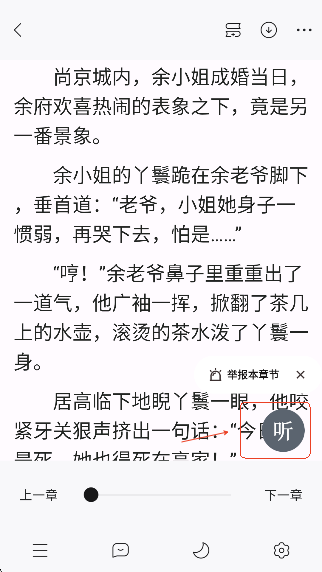 用户们进入阅读模式后,可以点击“听”,使用听书功能