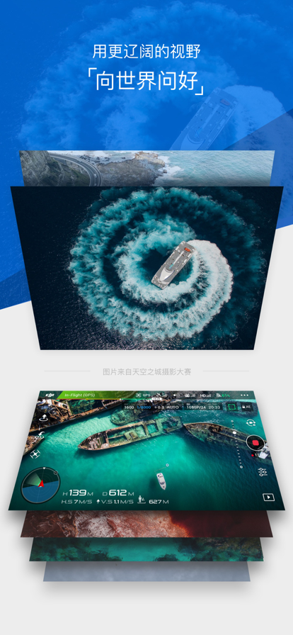 以及Inspire 2。可配合DJI 飞行器实现实时图传查看,相机参数设置,以及航拍视频和图片的编辑、分享等功能。