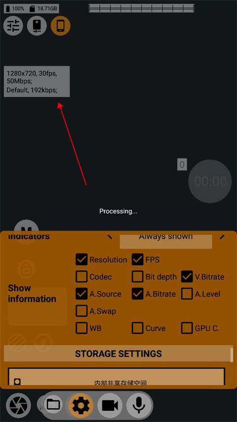 2、我们来看一号红框,按照从上到下,从左到右的顺序,功能分别是电池剩余电量,手机剩余存储空间,全局预设,当前使用镜头,屏幕方向,手电筒。