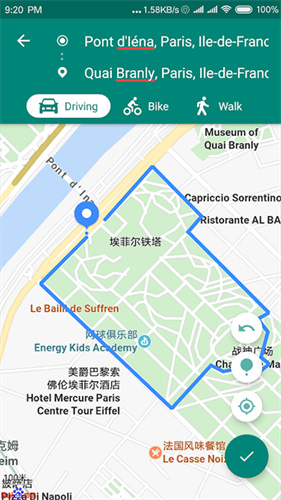 3、在地图中搜寻想要模拟的位置后点击右下角勾号按钮;