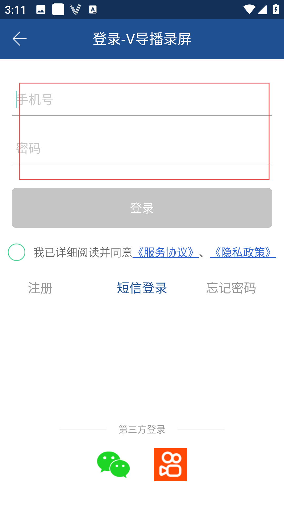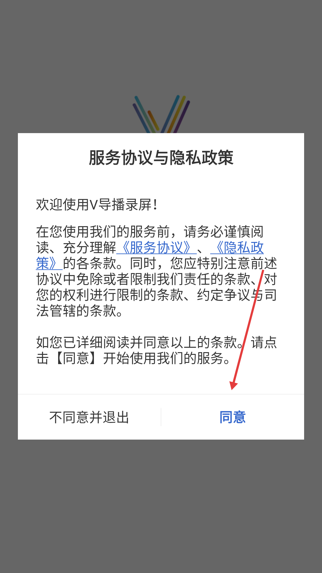 1、打开V导播录屏app,阅读服务协议与隐私政策后,点击同意进入app主界面。