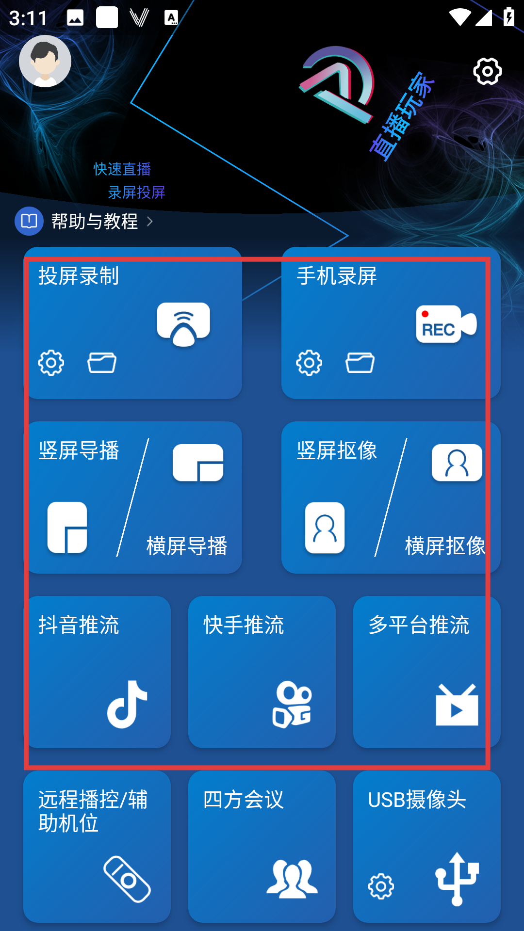 2、在主界面,可看到投屏录制,手机录屏,竖屏导播等多种功能选项,按需点击使用相关功能。