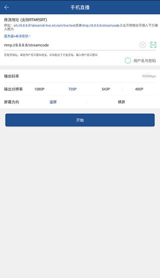 2、进行直播设置,输入推流地址(支持RTMPSRT),若推流地址,需费用户名与密码验证,则勾起右下方复选框,输入用户名与密码,接下来设置输出码率、输出分辨率和屏幕方向,设置完成点击下方的“开始”。