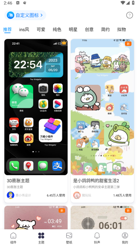 用户可轻松自定义图标,包括可爱、明星、创意、ins风、简约、拟物、纯色等多种类型,满足用户对主题个性化的各种需求。
