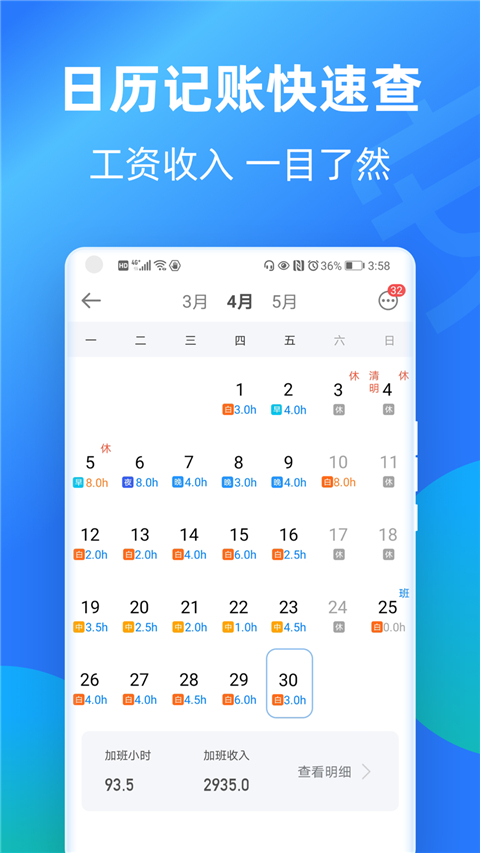 加班计算:该应用内置了丰富的公式和规则,能够根据公司设定好的加班制度自动计算出每次加班所得到的工资。