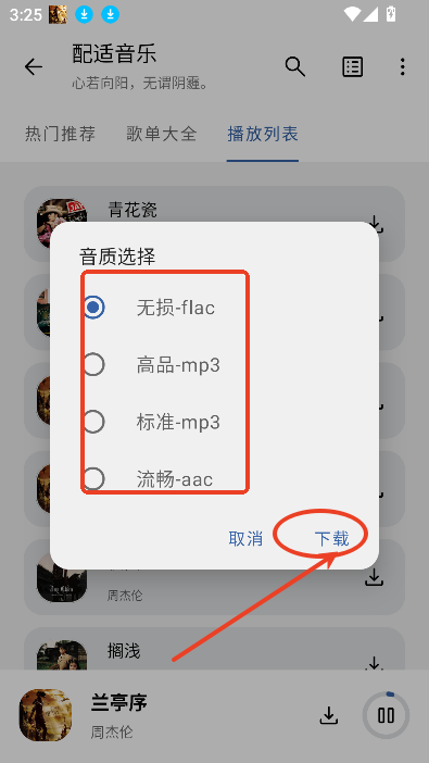 点击右侧下载按钮,可以直接下载歌曲,选择音乐品质,点击确定即可